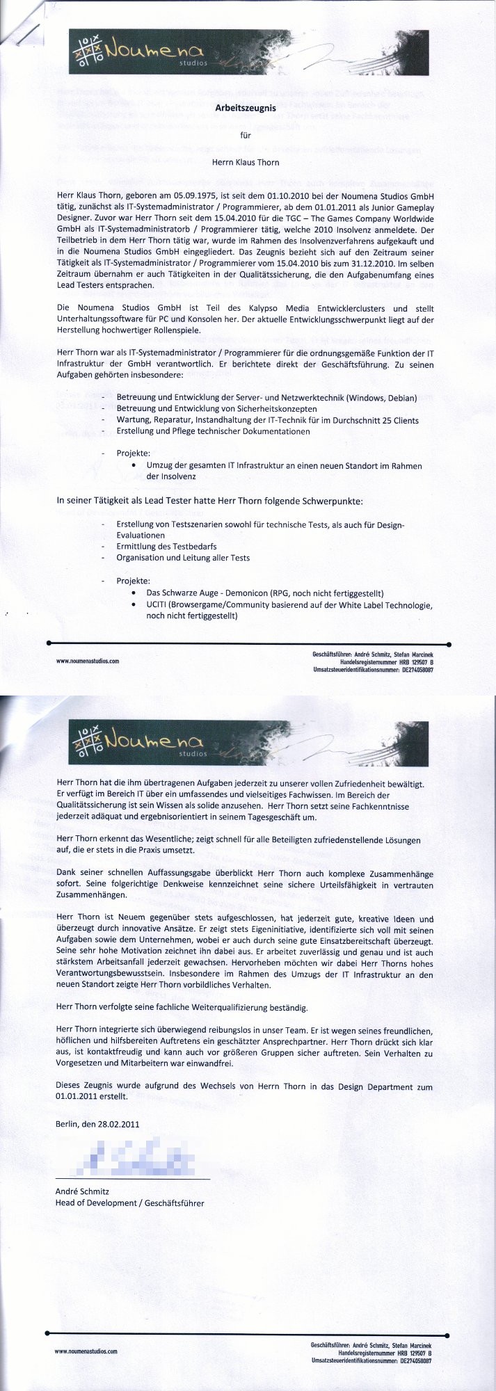| 11 | Junior Game Designer Noumena Studios GmbH (1. Halbjahr 2011) Gameplay für ein Action-Rollenspiel |